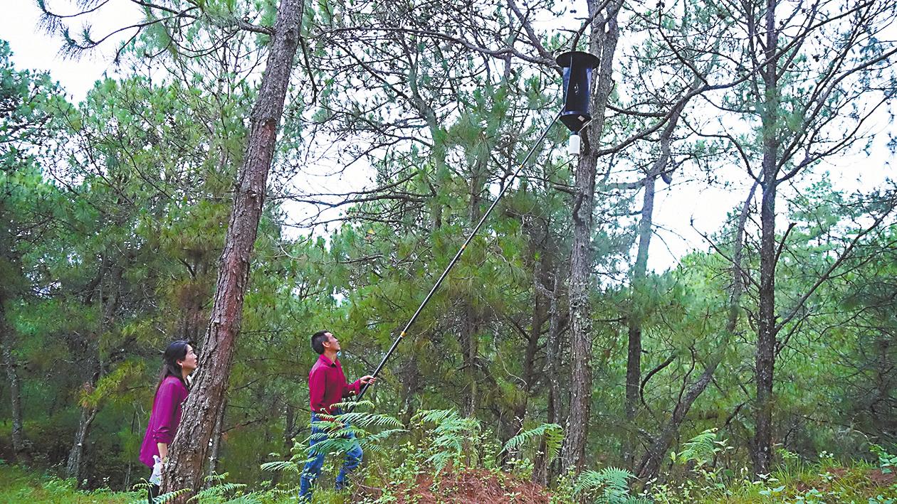 近日,在澄江市龙街街道左所水库周边的松林里,澄江市林业和草原局工作人员正采取有效措施开展松墨天牛诱捕收虫工作,并对近期的松墨天牛诱捕数据进行统计和更新,为精准防治松材线虫病打下坚实基础。通讯员 杨沛承 柳超贤 摄