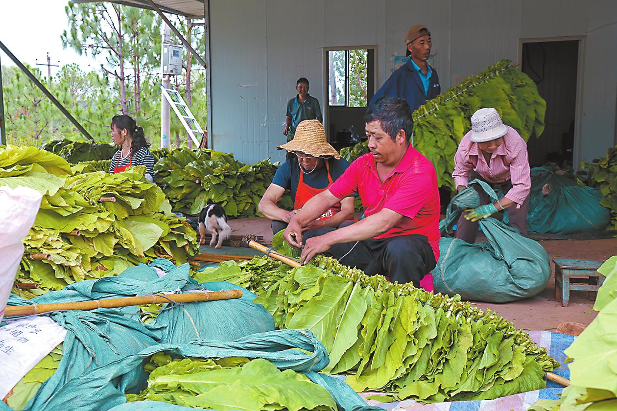 近日,在峨山县甸中镇下营村委会中营组烤房旁,烟农们熟练地将烟叶编杆上炕、开炉烘烤,全镇烤烟进入开烤期。据了解,甸中镇今年烤烟合同种植面积9900亩,合同收购量143万公斤。为促进烟叶高质量发展,甸中镇在加强烤烟中后期管理的同时,新建了85座电烤房,有效保证烟叶质量,降低烟农烤烟成本。