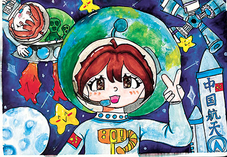 点评:小作者抓住特征将小小宇航员的形象详细描绘,使得人物饱满、生动,颇具动感。星空、火箭、空间站、外星飞船……诸多背景元素的选择营造出宇宙的氛围,让人感受到宇宙的浩瀚和神秘。作品构图合理,主次分明,色彩丰富。