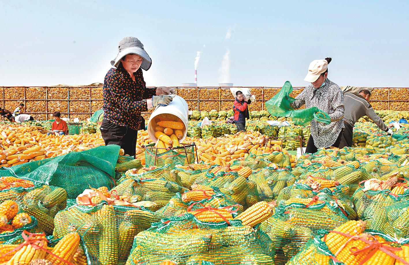 金秋时节,河北各地秋粮进入大面积收获期,农民利用晴好天气开展秋粮晾晒、收储等工作,确保秋粮入仓。