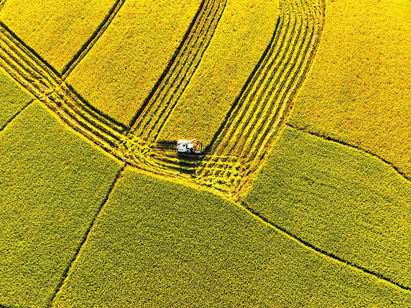 10月17日,湖南省常宁市三角塘镇长江村村民驾驶收割机收获晚稻(无人机照片)。