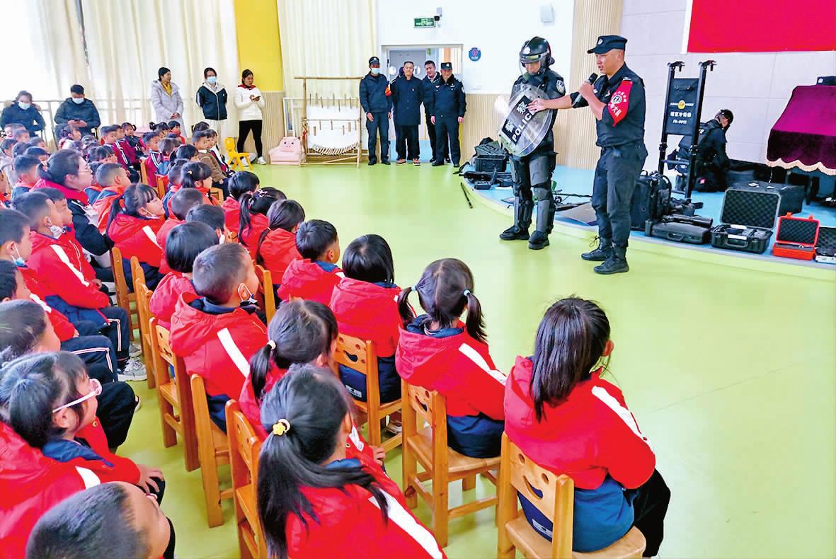 为进一步加强护校安园工作,增强广大师生的安全防范意识,提高自我保护能力,近日,玉溪市公安局红塔分局小石桥派出所联合巡特警大队分别到小石桥乡中心幼儿园、小石桥中心小学开展应急处突安全知识培训和警用设备展示。其间,巡特警大队突击队员向师生们展示了无人机、冲锋破窗梯、破门器械、索降突入设备等警用设备,让小朋友面对面领略不一样的 “警”色,零距离感受特警风采。 通讯员 曹丽梅 陈磊 摄