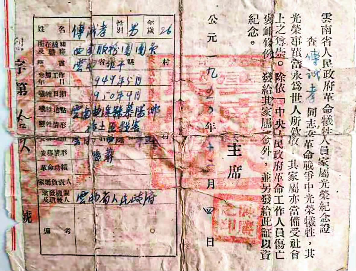 冬日暖阳,温暖和煦。1月9日,傅诚孝烈士证书捐赠仪式在玉溪市档案馆举行。在玉溪市、县党史部门的共同努力下,一个“寻亲”家庭70余年的守望,终于画上了圆满句号。 捐赠仪式上,一位年过七旬的老人受烈士傅诚孝亲属的委托,郑重地将1950年云南省人民政府主席陈赓签发的“云南省人民政府革命牺牲人员家属光荣纪念证”捐献给玉溪市档案馆。老人名叫徐瑞云,是中国人民解放军西南服务团干部后人、昆明退休干部。 据徐瑞云介绍,傅诚孝是中国人民解放军西南服务团云南支队一大队干部,当年分配到华宁征粮剿匪,在华宁县阳暮乡(登楼山)土匪暴动中英勇牺牲,时年仅26岁。傅诚孝烈士无后人,家住云南省师宗县竹基镇抵鲁村。傅诚孝牺牲后,有关部门将云南省政府颁发的烈士证转给了烈士的祖父傅传金,由于当时家庭条件差,家人没有能力外出寻访。烈士的父亲傅祖孝也想到儿子的牺牲地寻找,但烈士证记载的牺牲地为“云南省曲溪县幕阳乡”,在云南行政区划中没有这个地名。后来,烈士证传到烈士侄儿傅友文手上,他决心克服一切困难,也要找到伯父的安葬地,曾先后到建水等地寻找无果。2021年,傅友文通过网络查询得知,历史上的曲溪县阳暮乡(登楼山)普鲁味村已划归玉溪市华宁县管辖,后又通过徐瑞云联系玉溪市、县党史部门。在玉溪党史部门的帮助下,傅友文找到了烈士墓——傅诚孝静静地长眠在华宁万松山革命烈士陵园内,这才圆了迟到70余年的“寻亲梦”。 徐瑞云说,傅诚孝的这份烈士证明书有三个特点:一是证书由云南省人民政府主席陈赓签发,之后的都是毛泽东签发,属极少见的烈士证书;二是西南服务团在云南牺牲的烈士中,傅诚孝是唯一的云南籍;三是烈士牺牲地和籍贯都已发生变化,烈士亲属“寻亲”不易。 市档案馆馆长段琳娜说:“我们的档案除了收集整理单位部门形成的文件资料外,得益于广大群众的思想觉悟,感谢你们的捐赠。此次捐赠,得益于市委党史研究室、华宁县委党史研究室前期的查找、核验与确认。我们一定传承红色基因,赓续红色血脉,采取有效措施保管好原件,在做好仿真件的基础上,适时对社会公开。” 捐赠仪式上,段琳娜向傅友文的委托人徐瑞云颁发了《捐赠证书》,并合影留念。 (玉溪市委党史研究室供稿 李福生执笔) |
