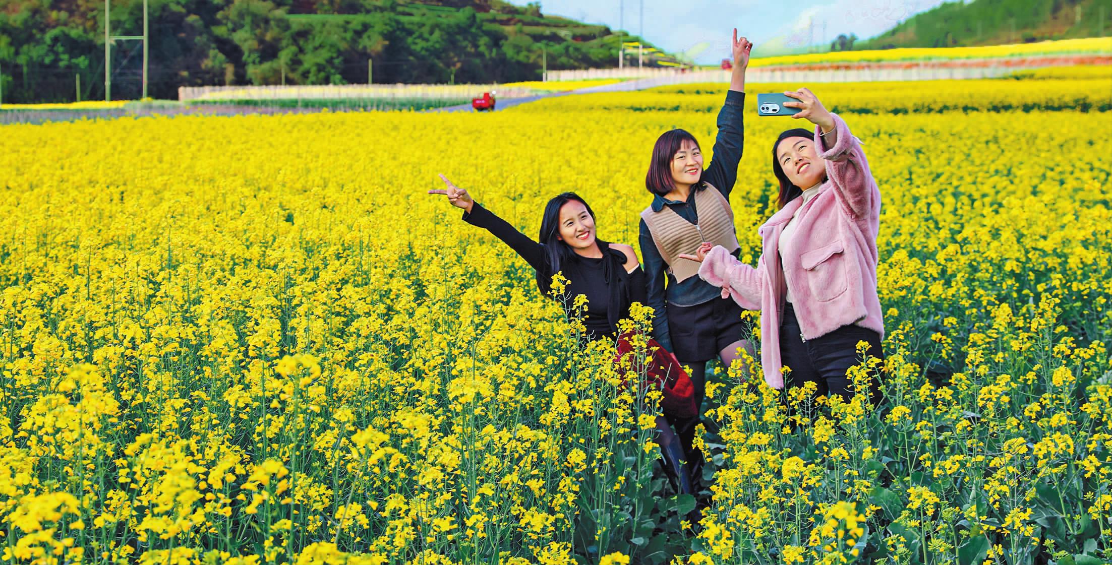 1月17日,在峨山县塔甸镇福家村附近,3名来自楚雄的游客在油菜花地里拍照。每年春节前后,从塔甸前往富良棚的乡村道路两旁,油菜花争相绽放,一片片金黄色的油菜花迎风摇曳,美不胜收,吸引了不少过往的游客驻足观赏。 本报记者 熊长青 摄