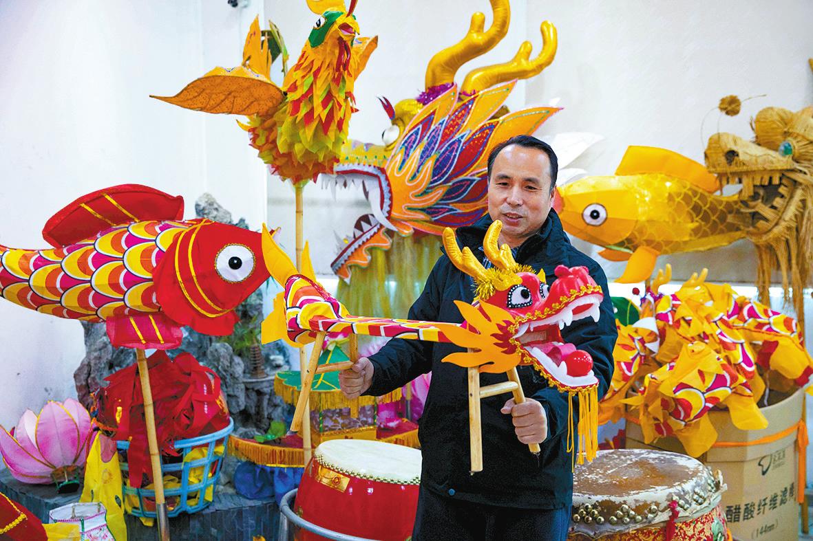 1月30日,南昌市青云谱区城南龙灯工厂,城南龙灯传承人史克滨展示为儿童设计生产的小板凳龙。起源于江西南昌青云谱区的城南龙灯是江西省级非物质文化遗产,迄今已有700余年历史。临近春节,城南龙灯工厂正在加紧生产,为龙年增添喜庆气氛。 孙睿泽 摄(新华社1月31日发)