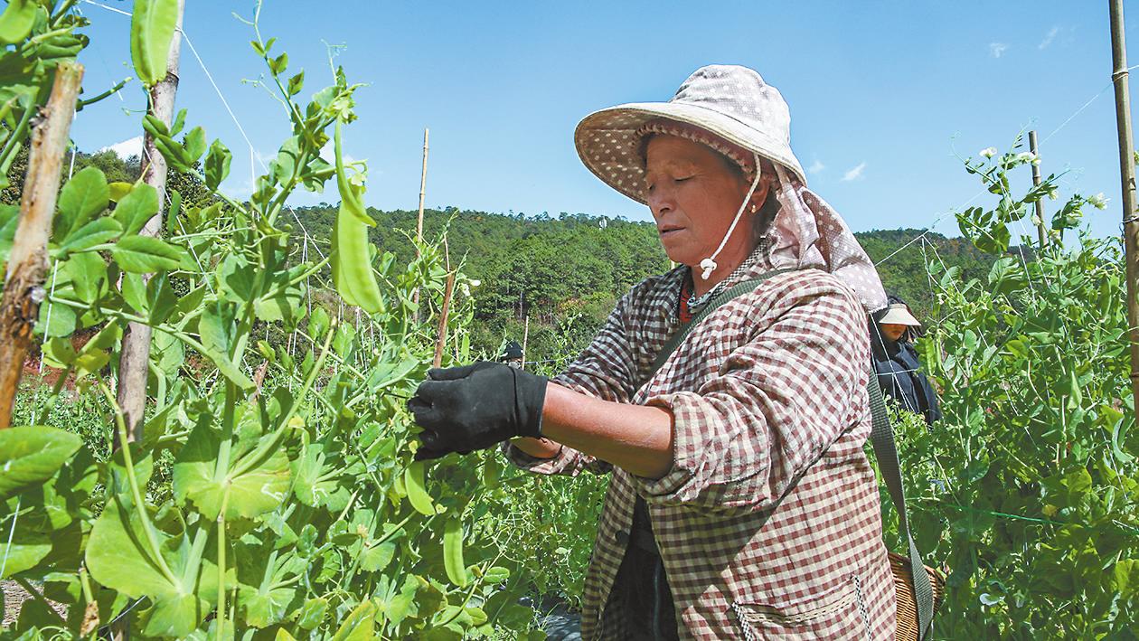 当前正值菜豌豆成熟上市时节,在峨山县塔甸镇海味村的田间地头,翠绿的菜豌豆缀满枝头,农户穿梭田间地头,忙着采摘。近年来,海味村因地制宜,大力推广山地菜豌豆种植,2023年全村菜豌豆种植面积约为1200亩,菜豌豆逐步发展成为助农增收的特色产业,为海味村乡村振兴注入活力。 本报记者 邓星瑞 宋蝶 摄