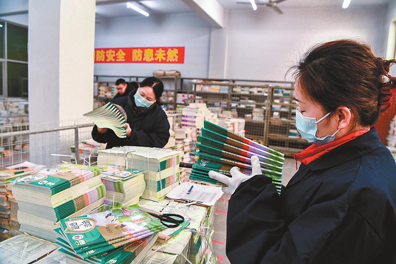 2月22日,在河北省石家庄市栾城区新华书店,工作人员在分类清点、分发、配送新学期教材。中小学开学在即,各地做好新学期教材接收、分发、配送等工作,为开学做好准备。 李明发 摄(新华社2月22日发)