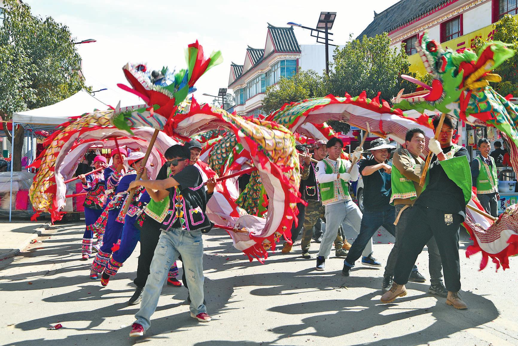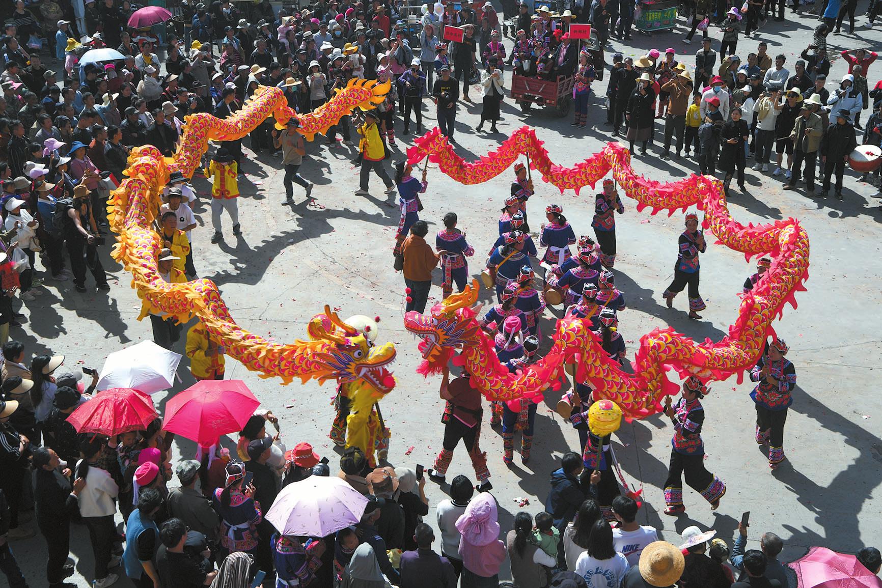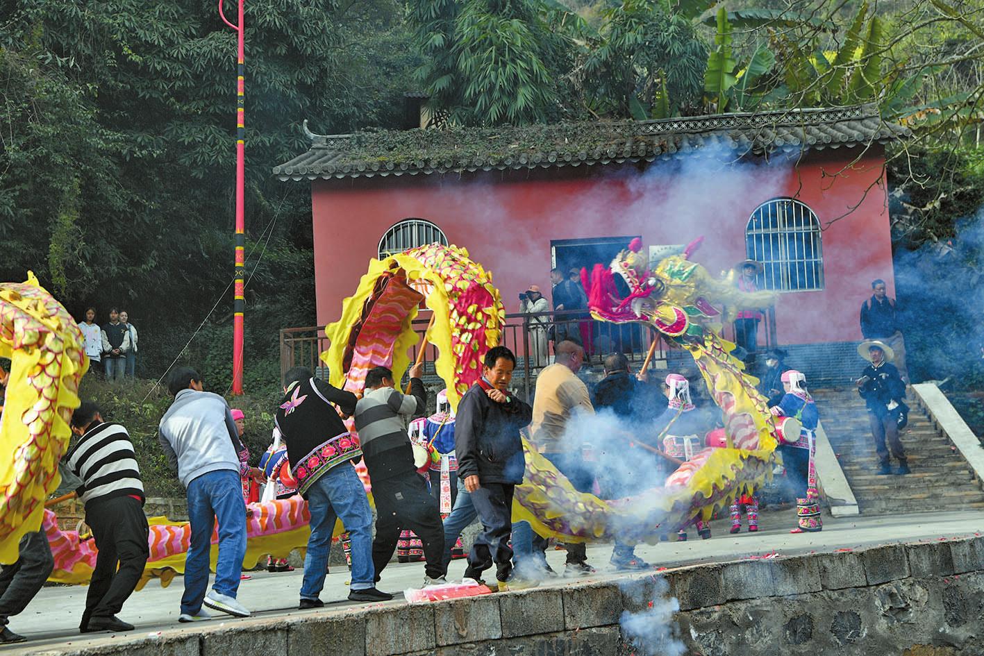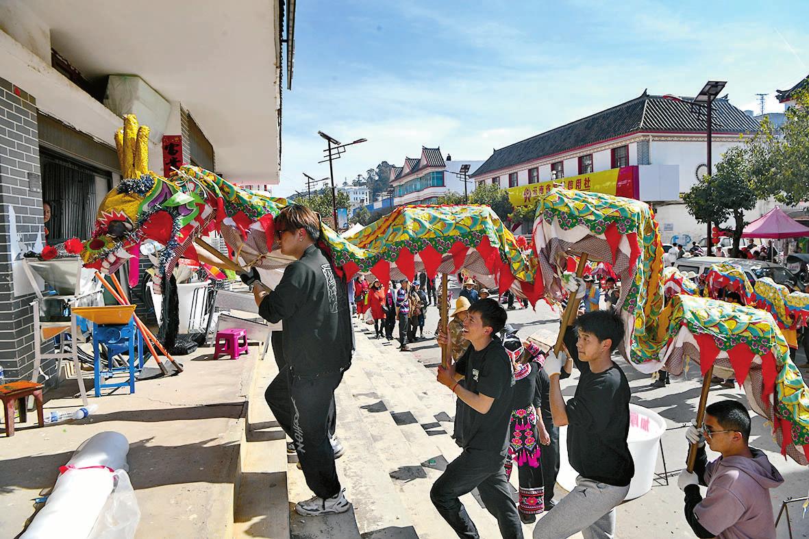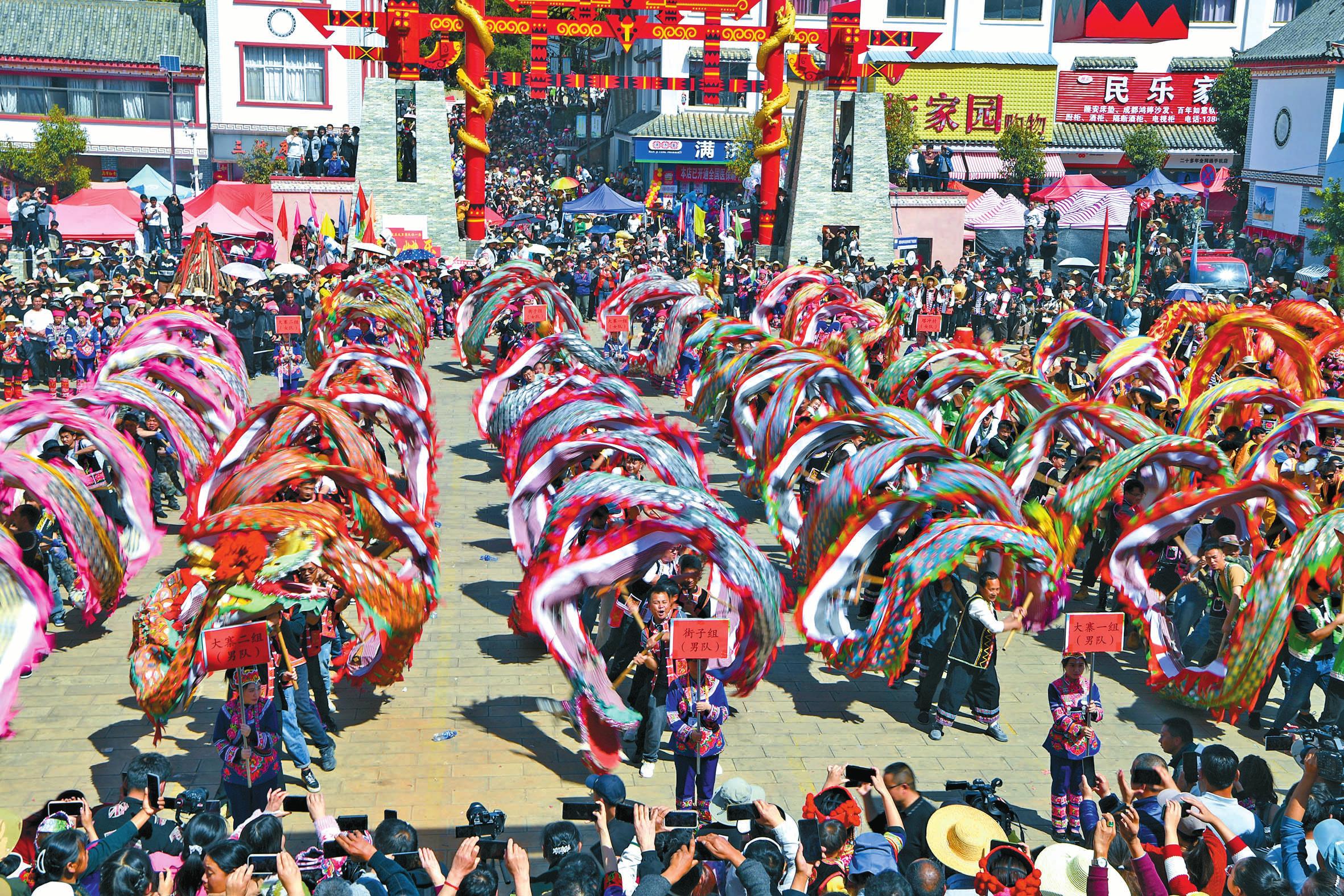 二月的峨山花香四溢,好客的彝家热情如火,彝乡的寨子年味浓郁。2月15日,大年初六,是峨山县富良棚乡正月初一后的第一个赶街天,当地俗称“开新街”,乡里举办了“盛世龙腾坡拉坡,响鼓扬花新彝乡”系列文化活动,其中祭龙、赛龙、龙巡街、龙拜年等活动尤为热闹,是游客体验独特龙文化的极佳时机。 “开新街”是峨山彝族的传统节日,彝语称为“哩夕哩”,流传于玉溪市峨山县塔甸镇、富良棚乡、大龙潭乡、岔河乡、甸中镇一带,是整个春节的高潮。各个乡(镇)的赶集日各不相同,今年首先从富良棚乡开始,随后是塔甸镇、甸中镇、岔河乡、大龙潭乡。“开新街”时,远近的彝族群众穿着节日盛装,扶老携幼,到集镇赶街,村寨青年男女带上扎制好的彩龙,肩挎花鼓,成群结队,到集镇比拼舞龙技艺,击鼓狂欢,展示形象。 富良棚乡被称为“舞龙之乡”,传承了古老的以“龙崇拜”为核心的祭龙、敬龙、舞龙、护龙文化。当地群众常说“舞龙不过街,不算开新街”,彝族舞龙就成为开新街必不可少的内容之一。 清风徐徐,菜花金黄。一年之计在于春,“开新街”这天,街道上人流如织,来自本地和外地的商贩在街道边摆开摊位,各种土特产品琳琅满目,名目繁多的特色小吃别有滋味,集市买卖异常活跃。勤劳的彝家人在货摊上购买春耕所需的生产物资和各种生活用品,新的一年忙碌的春耕生产即将开始。 鞭炮声响起,人们迅疾闪开,让出通道,舞龙队来到街头,开始舞龙巡街。男人们抬着长龙,女人们抬着短龙,孩子们抬着小龙,鞭炮声、花鼓声此起彼伏。舞龙队你方舞罢我登场,彩龙时而上下翻滚,时而蜿蜒漫游,时而腾空夺宝,时而盘旋仰啸,龙头一动,威风凛凛。舞龙队员都十分投入,动作协调、步伐稳健,进退有序、来去自如。有的在商店门口舞起长龙,为商家拜年,祝愿商家生意红火,财源滚滚。在彝家看来,龙是瑞兽,能给大家带来好运。舞龙队的豪情一浪高过一浪,引得商贩、游客驻足观看,沉浸在欢乐的海洋中,体验当地独特的民俗文化。 巡街表演结束后,富良棚乡16支舞龙队轮番上阵,纷纷向评委和观众展现精湛的舞龙技艺,展示彝家儿女奋力拼搏的精神面貌。人们站在房顶上、围在广场四周观看精彩的比赛,纷纷报以热烈的掌声。 “今天是黄道吉日,是塔甸镇一年一度‘开新街’的日子,特请‘花鼓娘娘’到小草海游玩,希望今天之后,该下雨的时候就下雨,农民栽什么成什么,养牛养羊养什么得什么,祝愿亲友及老人小孩身体健康,万事如意。”毕摩念诵完祭词后,峨山县塔甸镇在花鼓广场举行了“开新街”仪式。 塔甸镇小草海,一池碧水映蓝天,旁边是新修建的花鼓广场,周围菜花金黄,大寨和甸尾两村隔“海”相望,这里空气清新,阳光明媚,一切都透着春的气息。在毕摩主持下,两条龙和花鼓队把“花鼓娘娘”迎请到广场,“开新街”系列文化活动正式拉开序幕。除了各具特色的文化活动外,每个乡(镇)“开新街”都少不了舞龙表演。 中国龙的形象贯穿了中国历史文化的长河。作为我国传统文化的代表性符号之一,在演变过程中,龙逐渐融入了民间信仰和日常生活。人们相信龙能够保佑五谷丰登、风调雨顺,这种信仰逐渐演变成一种独特的龙文化,也形成了每年彝乡舞龙闹春、欢度佳节的热闹场景。 |