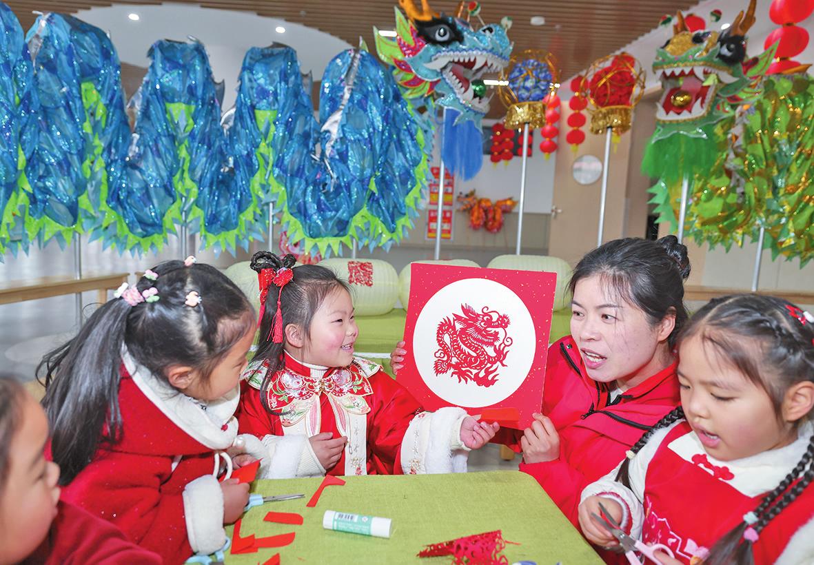 2月25日,李家巷镇中心幼儿园的老师给孩子们展示龙年主题剪纸。当日,浙江省湖州市长兴县李家巷镇中心幼儿园开展“趣探非遗 喜迎开学”开学第一课主题活动。孩子们在老师的带领下,学习与龙年相关的中国传统文化知识,体验舞龙、剪纸、做灯笼,近距离感受非遗传统文化的独特魅力。