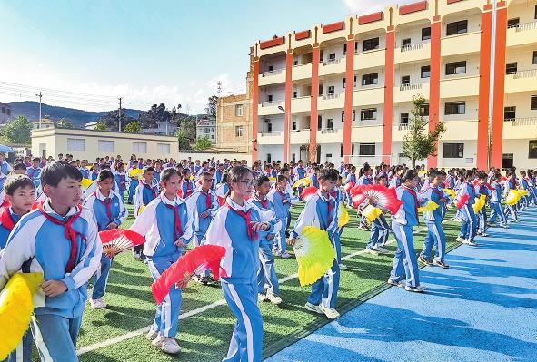 “远看茶叶青又青……”每天课间活动时间,欢快优美的花灯乐曲响起,易门县中屯小学的700多名学生手持花扇来到操场崴花灯欢度大课间。在《大茶花》等经典的玉溪花灯乐曲声中,大家手中的花扇时而打开,时而合拢,动作挥洒自如,尽显青春活力。 近年来,易门县中屯小学将艺术与体育有机融合,为课间操注入新活力。为深入推进阳光体育运动,促进学生全面发展,在县文工团专业老师的指导下,易门县中屯小学不断探索创新,把经典的玉溪花灯改编为课间操。学校有关负责人说:“花灯操深受学生喜爱,跳花灯操不仅丰富了课间内容,让学生锻炼身体、增强体质,还让学生充分领略到玉溪花灯的韵味和魅力。” 学生们纷纷表示,丰富有趣的课间操让大家越来越爱运动,还了解了许多和花灯有关的知识。 (通讯员 张婵娟 龚常金 彭艳 文/图) |