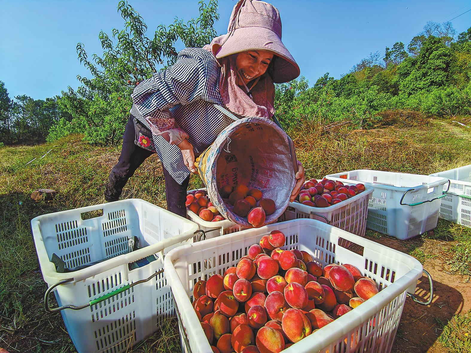 近日,在新平县漠沙镇双河村脚底莫小组的桃园,工人们正忙着采摘桃子。