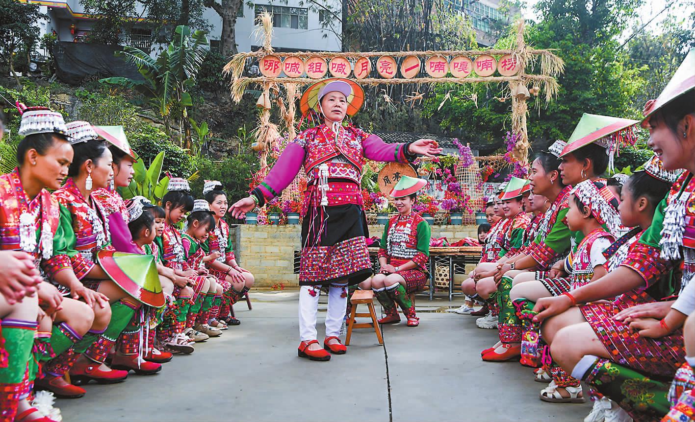 近日,新平县水塘镇水塘社区哪喊小组群众接受傣族非物质文化遗产 “喊月亮”培训。 “喊月亮”是水塘镇花腰傣一种民俗活动,被列为省级非物质文化遗产项目。新平县利用 “喊月亮”民俗活动契机,安排民间传承人进行 “喊月亮”、广场舞、傣族舞等非遗文化的教学培训,保护传承傣族优秀文化,积极践行文化振兴。 本报记者 崔永红 摄