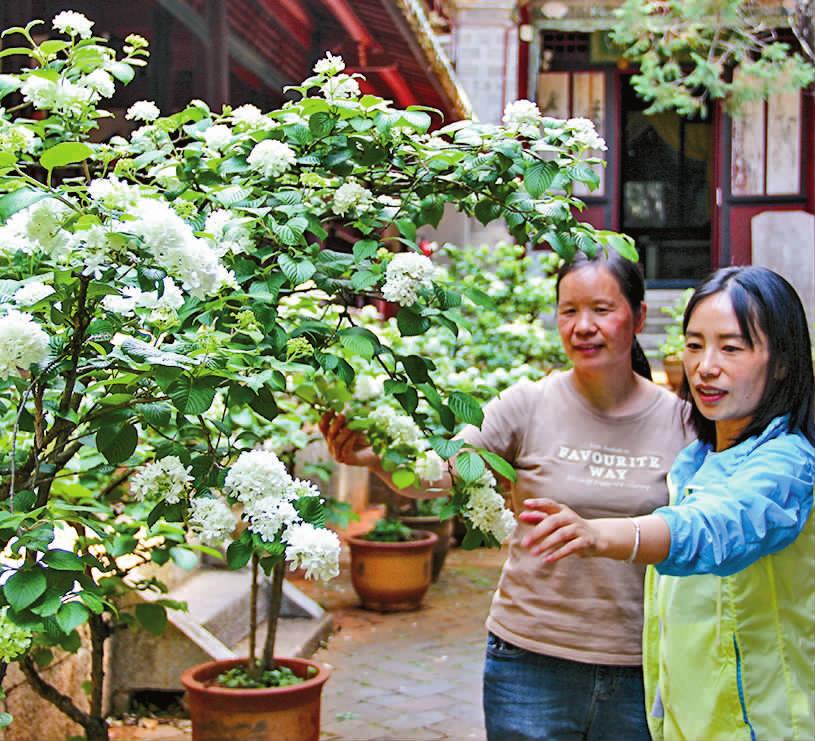 近日,团团簇簇的木绣球花将通海秀山历史文化公园装点得格外素雅,引来游客拍照打卡。据悉,通海秀山历史文化公园栽种木绣球已有多年历史,盛花期的木绣球花苞颜色清丽,或鲜绿,或嫩绿,或淡绿,或乳白,与新绿的叶片融为一体,一朵朵、一簇簇开得甚是热闹。 本报记者 史桦 摄