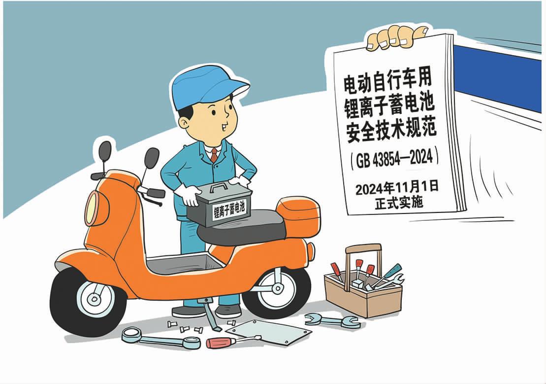 记者5月6日从工业和信息化部获悉,由工业和信息化部组织起草的 《电动自行车用锂离子蓄电池安全技术规范》 (GB43854—2024)强制性国家标准已由市场监管总局 (国家标准委)发布,将于2024年11月1日正式实施。 朱慧卿/作 (新华社5月6日发)