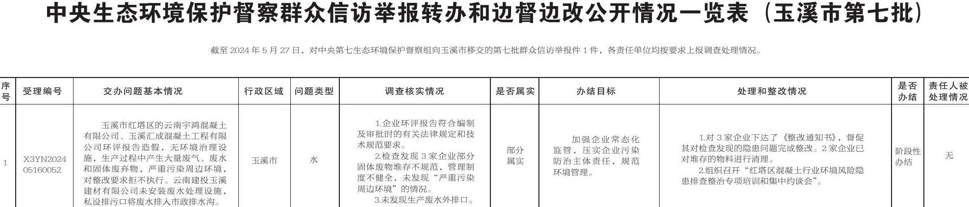 中央生态环境保护督察群众信访举报转办和边督边改公开情况一览表(玉溪市第七批)