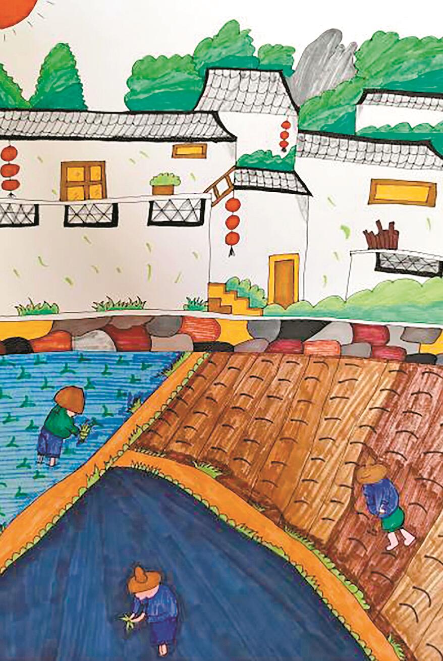 点评:红日绿树、白墙黑瓦、田野小径,火红的灯笼、劳作的人们……小作者将这些元素合理搭配,勾画出一幅清新自然、生动写实的美丽乡村画卷。作品色彩搭配适宜,线条流畅,构图饱满。