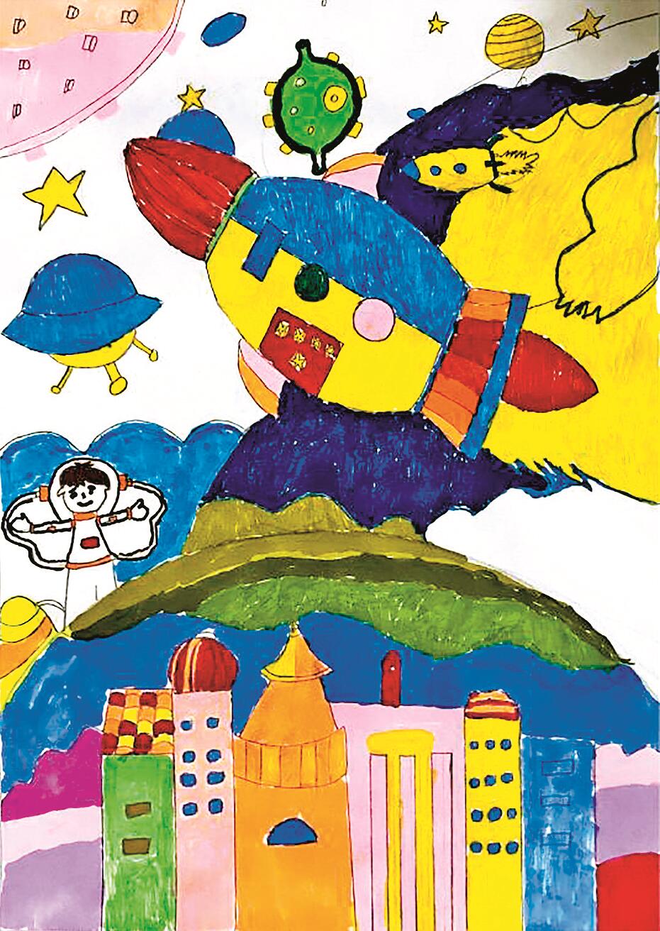 点评:小作者紧扣主题,展开联想,认真下笔,用线条、色块展现出一场紧张生动的“城市保卫战”。作品内容丰富,色彩夺目,主题突出,颇具想象力。
