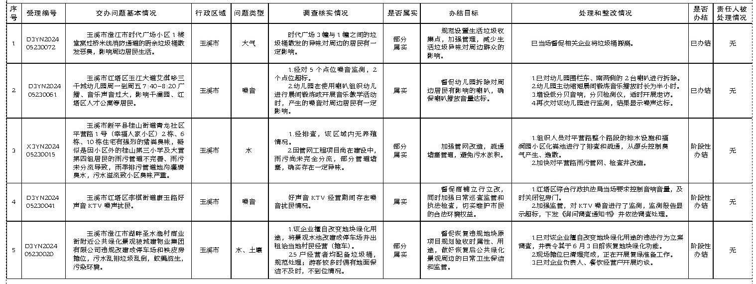 截至2024年6月3日,对中央第七生态环境保护督察组向玉溪市移交的第十四批群众信访举报件5件,各责任单位均按要求上报调查处理情况。