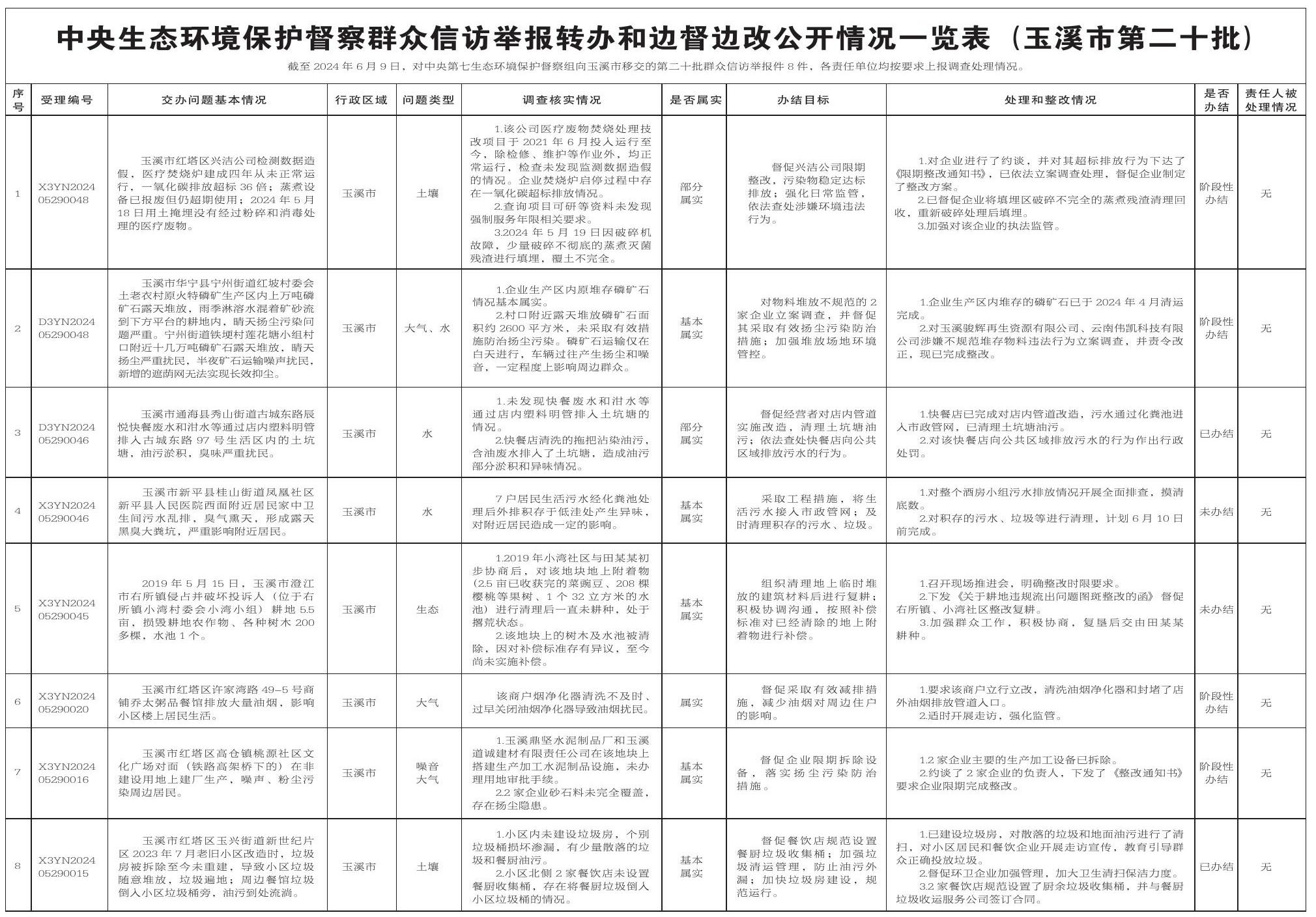 截至2024年6月9日,对中央第七生态环境保护督察组向玉溪市移交的第二十批群众信访举报件8件,各责任单位均按要求上报调查处理情况。