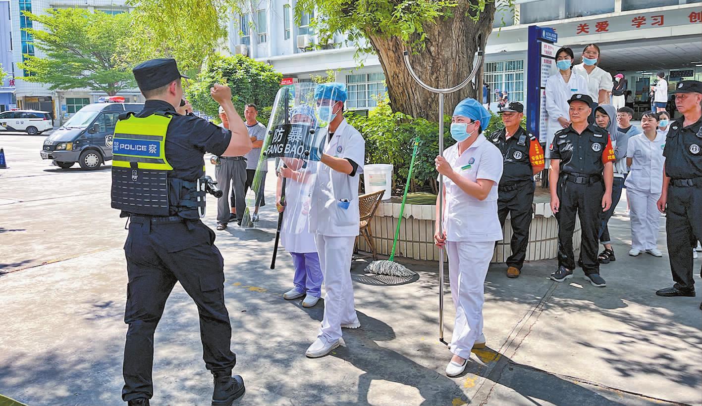 本报讯(通讯员 黄华)5月21日下午,通海县九龙卫生院像往常一样平静,突然一名“歹徒”持刀闯入院内,对卫生院职工和患者行凶,卫生院安保人员立即报警,并手持胶木棍同“歹徒”进行周旋。九龙派出所民警接警后立即赶往卫生院,使用钢叉、警棍、盾牌等器械与卫生院安保人员协同作战,将“歹徒”成功制伏并带离。这是通海警方正常开展的一次应急防暴演练活动。整个演练过程组织严密、分工明确、安全有序,达到了预期效果。 为提高全市医院、学校等重点单位的应急处置能力,提升保安队伍处置突发事件的业务素质和实战水平,切实维护正常就医和教学秩序,保障患者、医护人员及广大师生的人身安全,努力构建和谐、安全的医疗、教学环境,连日来,玉溪市各地公安机关加强与教体、医疗部门的联动配合,组织民警到各地医院、卫生院、大中小学、幼儿园及其他重点单位,开展各种应急处置实操安全演练。市、县、乡三级公安机关联动,公安、卫健、教体部门相互配合,坚持“贴近实战、提升能力”,扎实有序地推进实战培训和实操演练工作,进一步强化了警务工作和保安行业联勤、联动、联处、联治工作合力。 演练过程中,民警以普及安全防范知识、提高安全防范能力为重点,向安保人员、医护人员、师生讲解突发事件防范及应对方法,现场演示指导警用盾牌、警棍、钢叉、抓捕器等器械的使用方法和技巧,并安排相关人员进行实操演练。 此外,各地公安机关还组织民警辅警全面深入辖区医疗机构和学校,全方位开展矛盾纠纷和安全隐患排查,加强医院和校园周边环境整治,重点聚焦单位安全管理中的薄弱环节和风险漏洞,开展防溺水、防霸凌、防范电信网络诈骗等安全教育。 目前,各地“警保”联勤安防演练仍在持续开展。 |