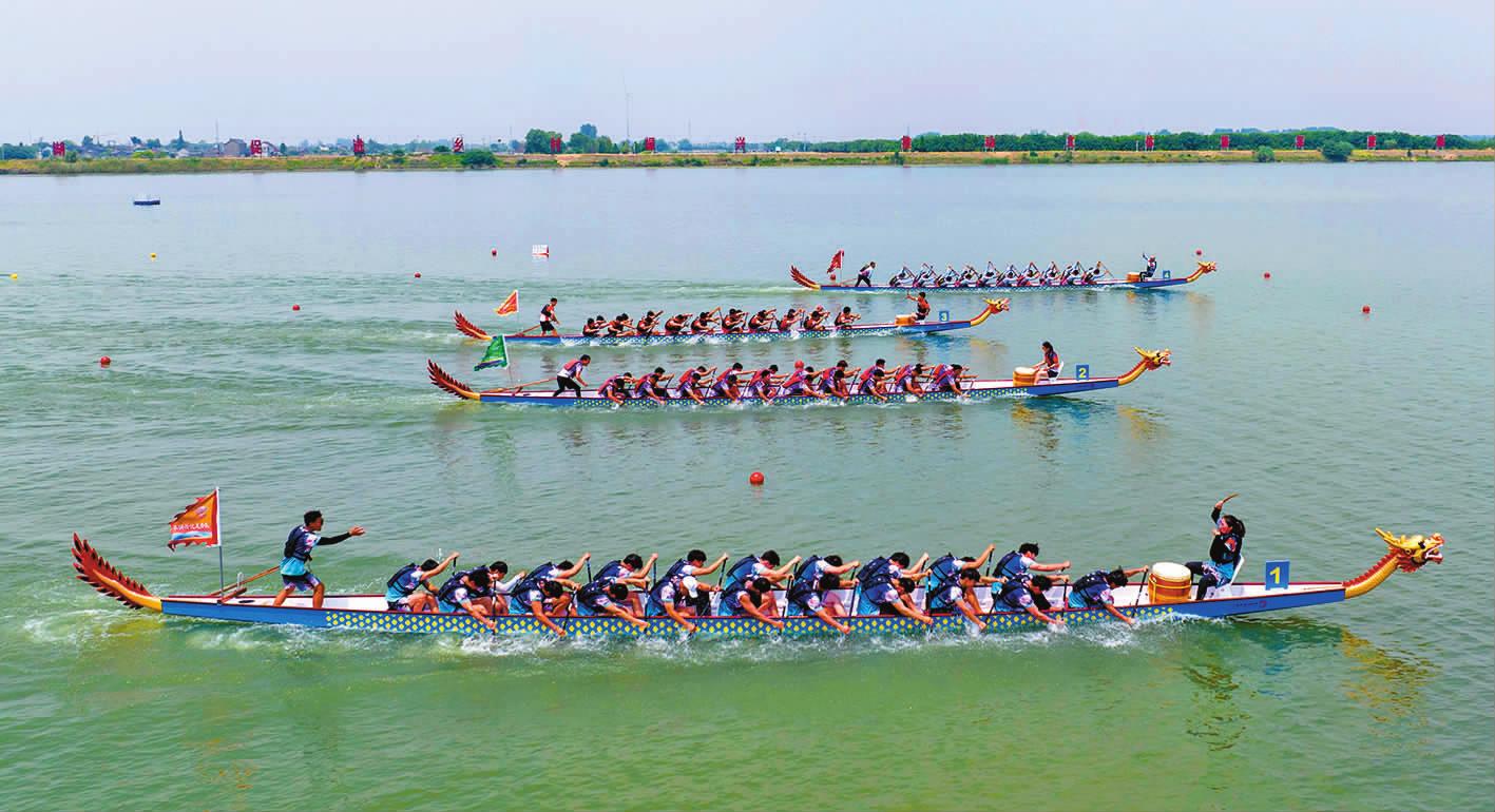 6月10日,在江苏省泰州市水上运动训练基地,人们进行龙舟竞渡(无人机照片)。汤德宏 摄(新华社6月10日发)