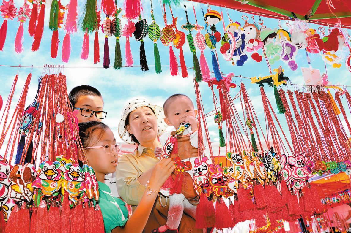 6月9日,人们在甘肃省平凉市静宁县城关镇端午市场上选购香包。 王毅 摄(新华社6月10日发)