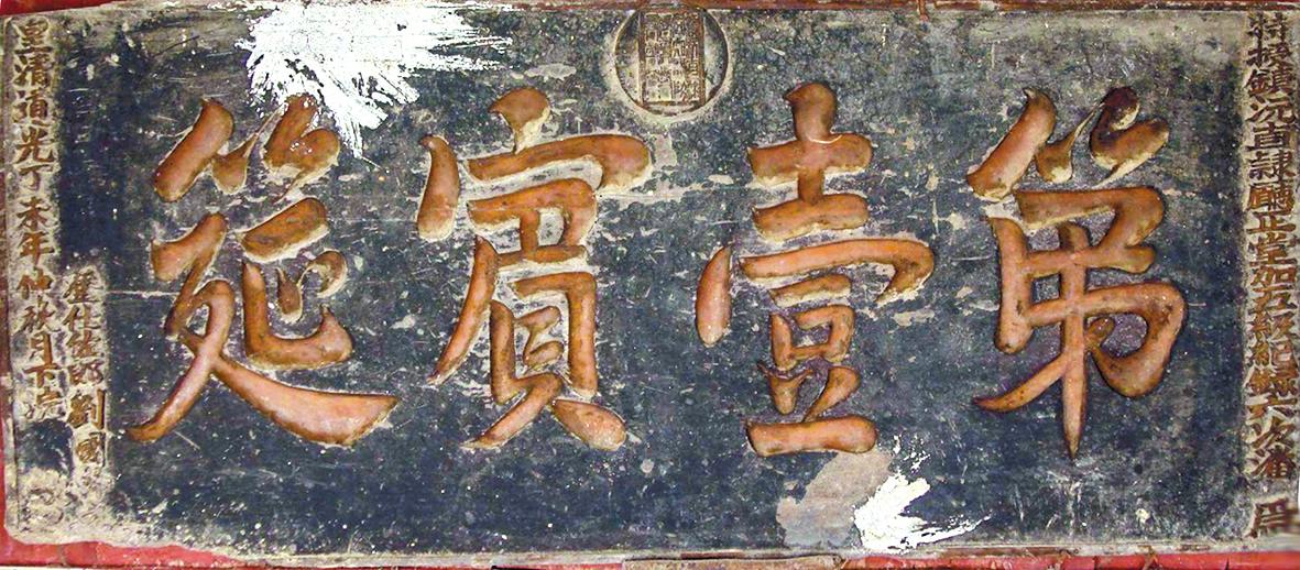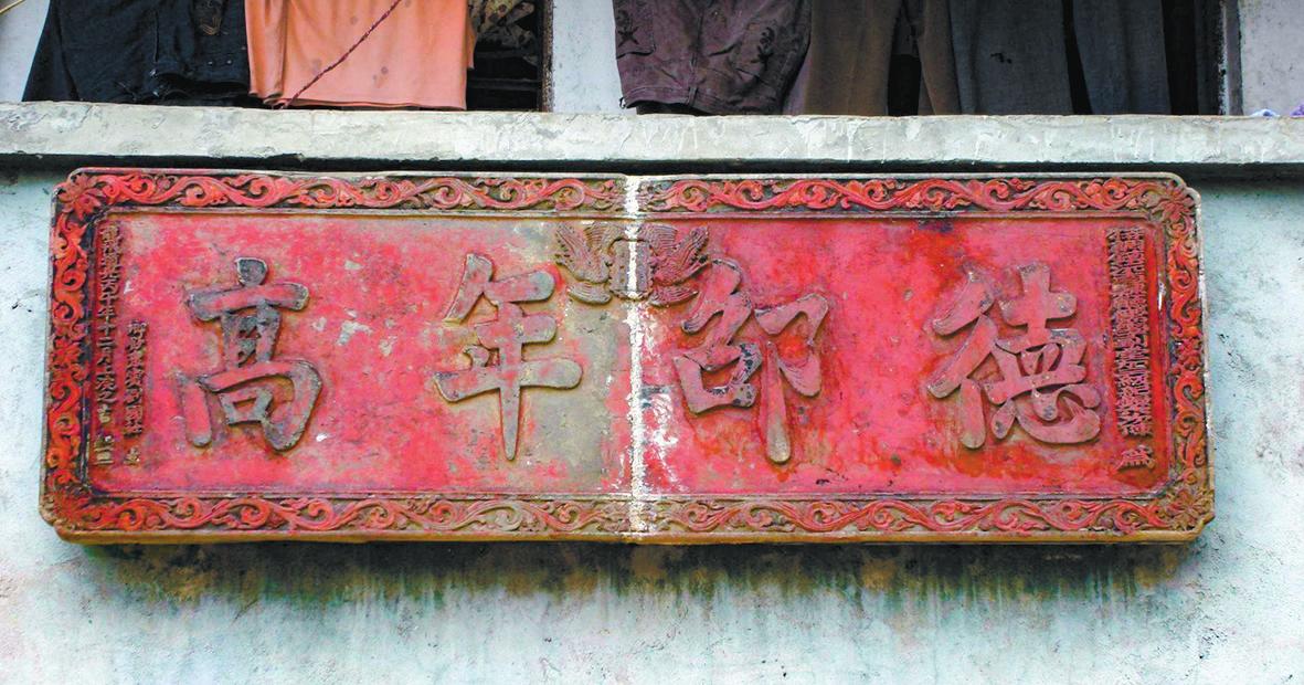 道光年间的祝寿匾 先来说第一块大匾“德邵年高”。上款为“特调镇沅直隶厅儒学副堂加三级记录六次陈为”,中间四个大字“德邵年高”,下款为“乡饮众宾刘国干立,龙飞道光丙午年十二月上浣之吉榖旦”。道光丙午年为1846年,再过四年,道光帝在内外交迫中忧愁成疾,勉强支撑着临朝办理政事,后病情加重,驾崩于圆明园慎德堂内。1846年的冬天,在边远的库独木村,镇沅直隶厅儒学副堂姓陈的官员为当地乡绅刘国干祝寿,并赠送了“德邵年高”的大匾。 所谓“乡饮众宾”,即乡饮酒礼的宾介,多选贤良方正、德高望重者任之。乡饮是古代一种庆祝丰收、尊老敬老的宴乐活动。清代赵翼有诗云:“举觞应唤新先辈,乡饮惭叨旧大宾。”这种习俗,在当时的社会中起到了敦亲睦族、止恶扬善的作用,人们都以选上乡饮大宾作为一种巨大荣耀。直到道光二十三年(1843年),清政府将各地乡饮酒礼的费用拨充军饷,这种仪式才被下令废止,前后沿袭约三千年之久,在中国历史上产生过深远的影响。由此可知,刘国干参加乡饮酒礼的时间应在1843年前。后来仪式虽然停办了,“乡饮众宾”的荣誉却保留了下来。 赠给刘国干的这块匾额做得十分精细,四周为草叶纹围绕,中间有龙凤印。可惜的是,在20世纪中期,匾额被人为锯为两截,如今虽然拼合在一起,却已经看不清龙凤印文。能享受这样荣誉的人,一般在八十岁以上,可以想见,刘国干当年为当地做了许多实事,年岁已高,却依然健在,所以才会获得“德邵年高”的殊荣。