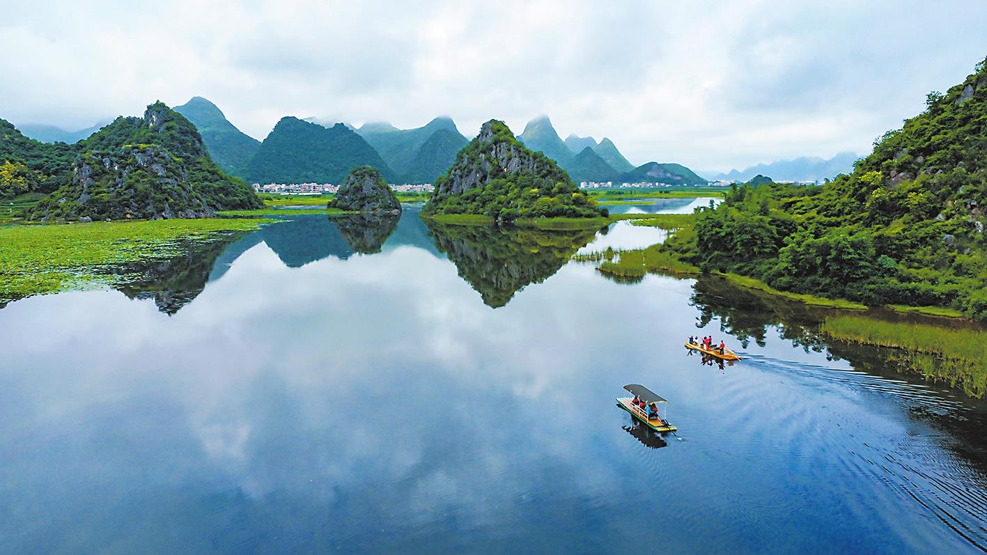 6月18日,游客在普者黑景区内乘船游览(无人机照片)。