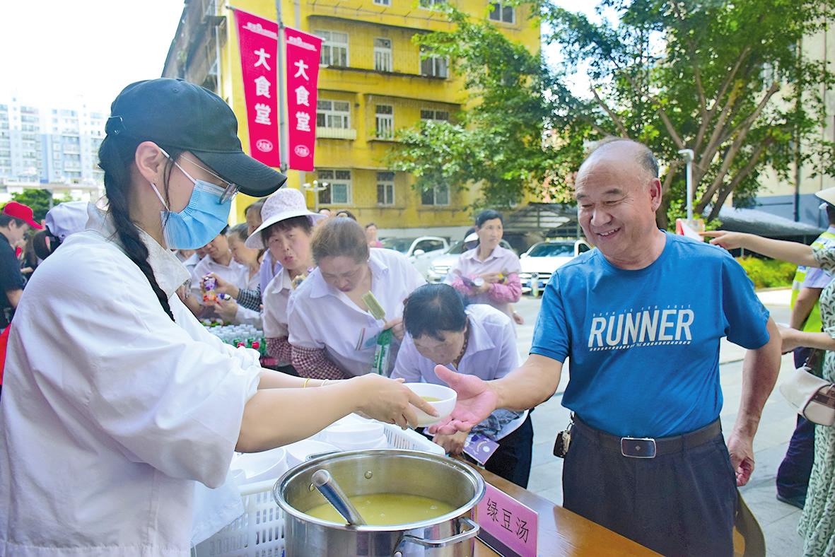 6月21日,红塔区凤凰街道广场社区开展“夏日送清凉”志愿服务,为快递员、外卖配送员、网约车司机、货车司机以及环卫工人等户外劳动者免费提供绿豆汤、冰棒、饮料、清凉油、帽子等防暑降温食品、用品,并开展健康知识宣传、健康体检服务。 本报记者 刘黎 摄