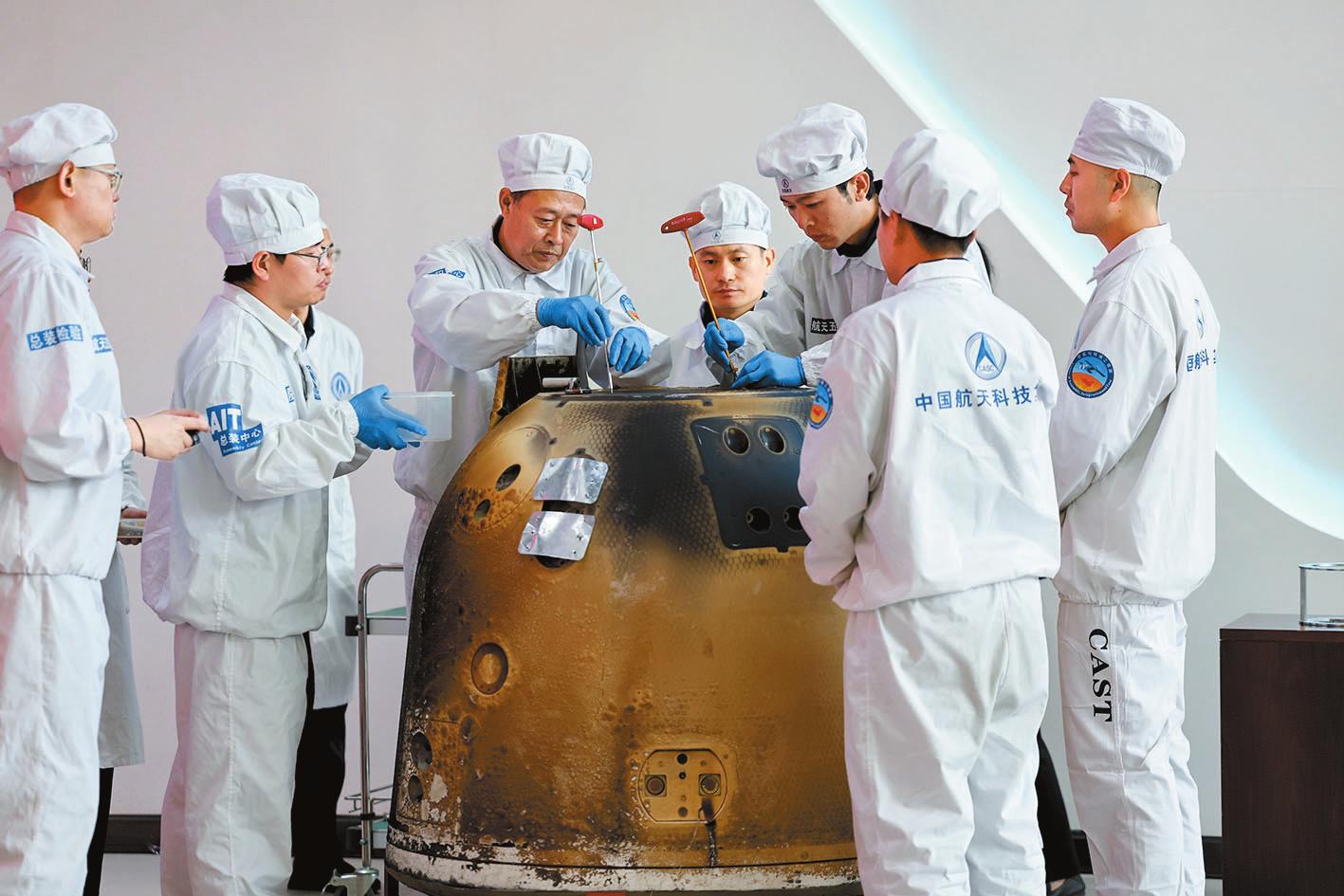 6月26日下午,嫦娥六号返回器开舱活动在中国航天科技集团五院举行。仪式现场,科研人员对嫦娥六号返回器进行开舱,检验关键技术指标完成情况。