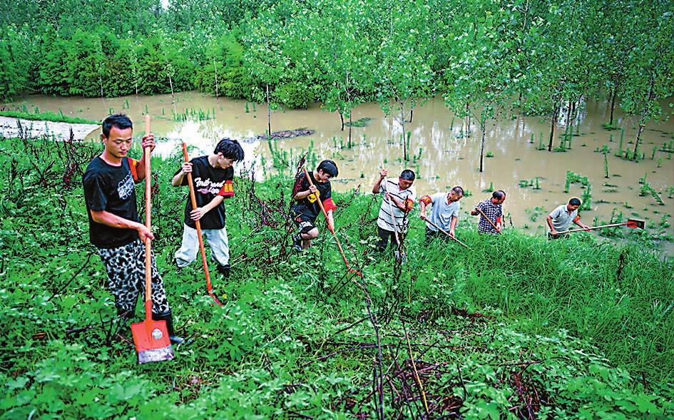7月14日,阜南县王家坝镇王家坝村村民在巡堤查险。受持续强降雨影响,7月13日,淮河形成2024年第1号洪水,淮河干流王家坝站水位超过警戒水位。截至7月14日18时,淮河干流王家坝站水位27.86米,超过警戒水位0.36米。目前,安徽省阜阳市阜南县各部门采取系列举措,密切监测水情、加强巡堤查险、充实防汛物资,全力做好防汛应急工作。 新华社记者 黄博涵 摄 (新华社7月14日发)