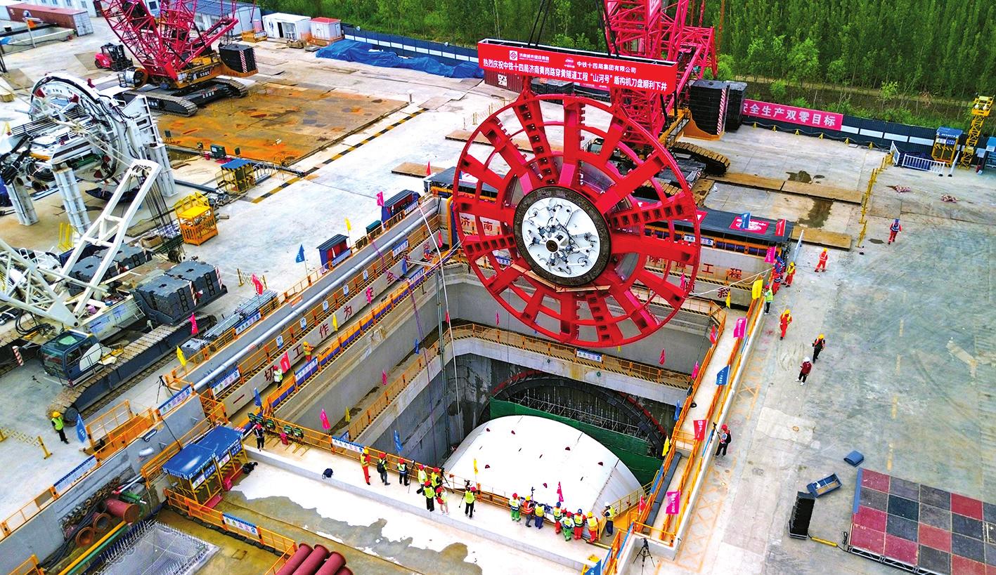 7月24日,“山河号”盾构机刀盘被履带式起重机从地面吊运至济南市黄岗路穿黄隧道盾构始发井(无人机照片)。当日,由中铁十四局集团承建的济南市黄岗路穿黄隧道“山河号”盾构机刀盘顺利吊装下井,为黄岗路穿黄隧道盾构机始发穿黄奠定基础。黄岗路穿黄隧道是济南市跨黄河通道总体布局中的重要一环,工程建成后将助力济南主城区与新旧动能转换起步区互联互通,促进济南跨黄河发展。
