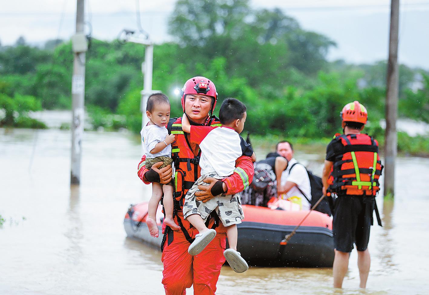 7月28日,在湖南省资兴市唐洞街道镜塘村,救援队员在转移被困群众。