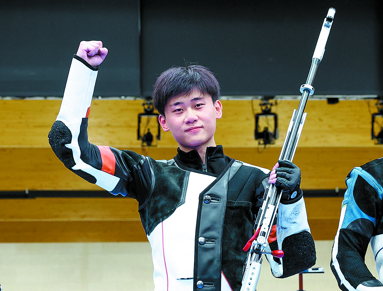8月1日,刘宇坤在夺冠后庆祝。当日,在法国沙托鲁举行的巴黎奥运会射击男子50米步枪三姿决赛中,中国选手刘宇坤夺得冠军。
