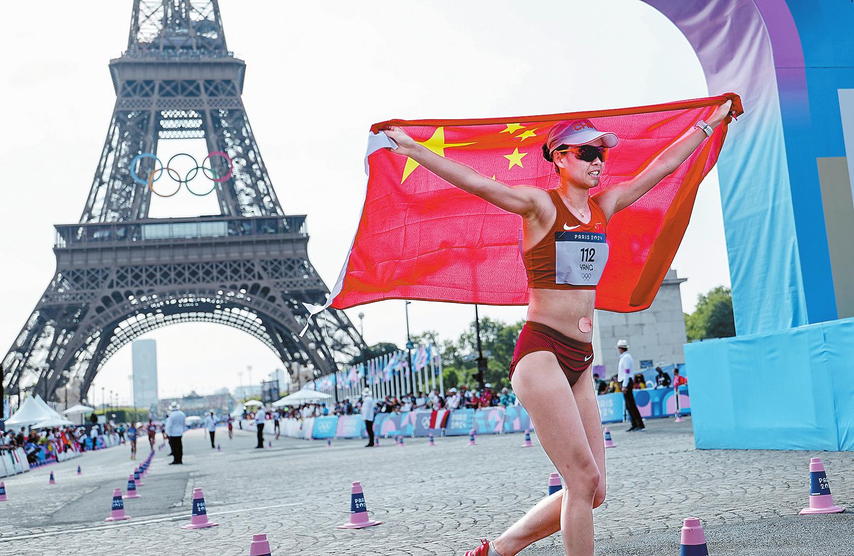 8月1日,中国选手杨家玉在赛后庆祝。当日,在巴黎奥运会女子20公里竞走比赛中,中国选手杨家玉夺得冠军。