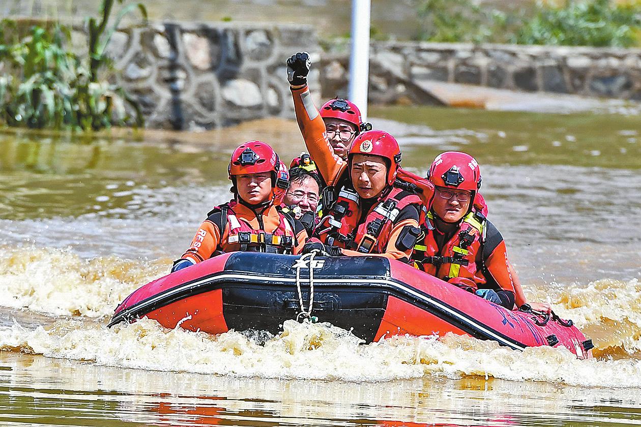 近日,吉林省临江市消防救援大队世纪大街站副站长白云天(右二)在转运受困群众时,用手势指挥队员操控船只。