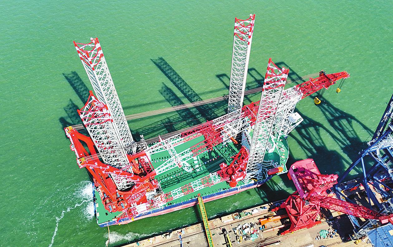 8月28日,搭载智能船舶系统的自升自航式海上风电安装平台“港航平5”在青岛西海岸新区交付(无人机照片)。当日,搭载智能船舶系统的自升自航式海上风电安装平台“港航平5”,在中国船舶旗下的青岛海西重机有限责任公司举行交船仪式,正式交付业主天津港航工程有限公司。据了解,“港航平5”平台船长135米,宽50米,最大作业水深70米,最大起重能力1800吨。 张进刚 摄(新华社8月28日发)