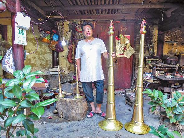 他生活在一个铜匠世家,从小就与铜器打交道。一张“铜皮”(原材料)到他的手里,不用多长时间就可以做成一件响器、一个铜锅、一把铜瓢,或是一个精美的铜烟盒。现在,他家以制作铜号为主,客户需要什么样的长号,他就可以制作出什么样的来。