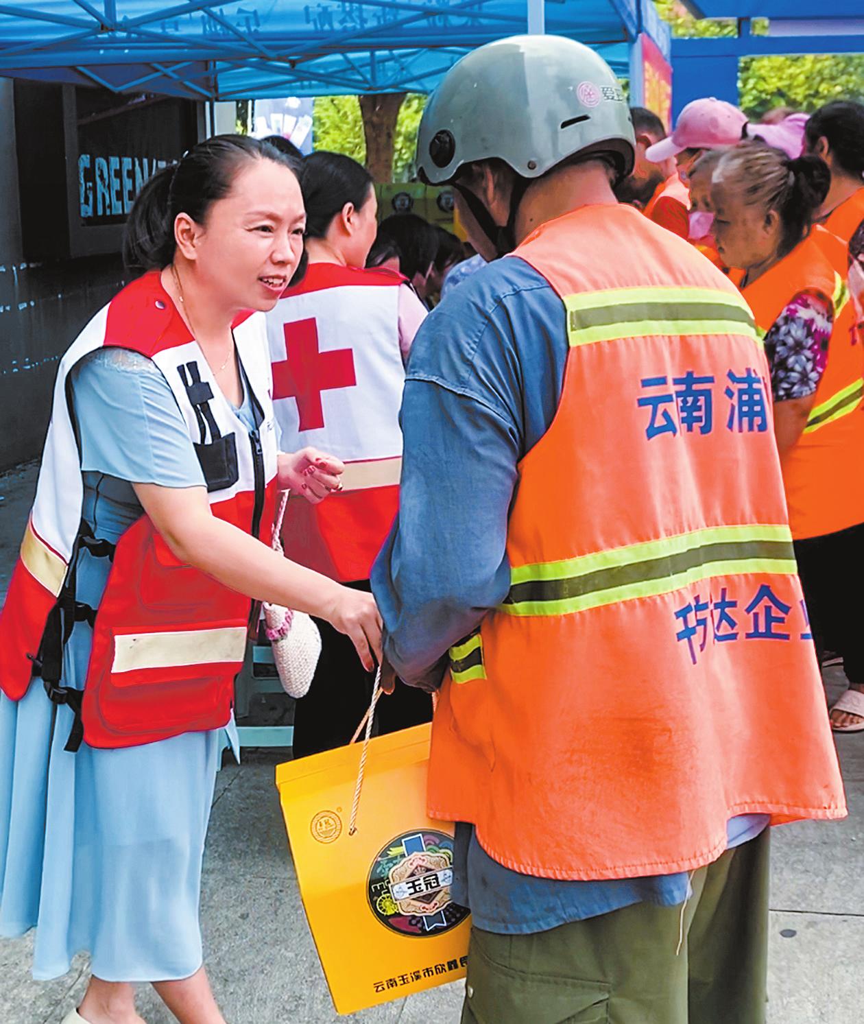 中秋佳节即将来临,元江县党群服务中心、县红十字会联合“红色联盟商家”开展“喜迎中秋 情暖元江”慰问环卫工人活动。截至今年,“红色联盟商家”之一的爱心企业丰元超市,已经连续8年向环卫工人赠送中秋礼包,以实际行动向环卫工人表达关心与关爱。 通讯员 余娇 范魏嵩 摄