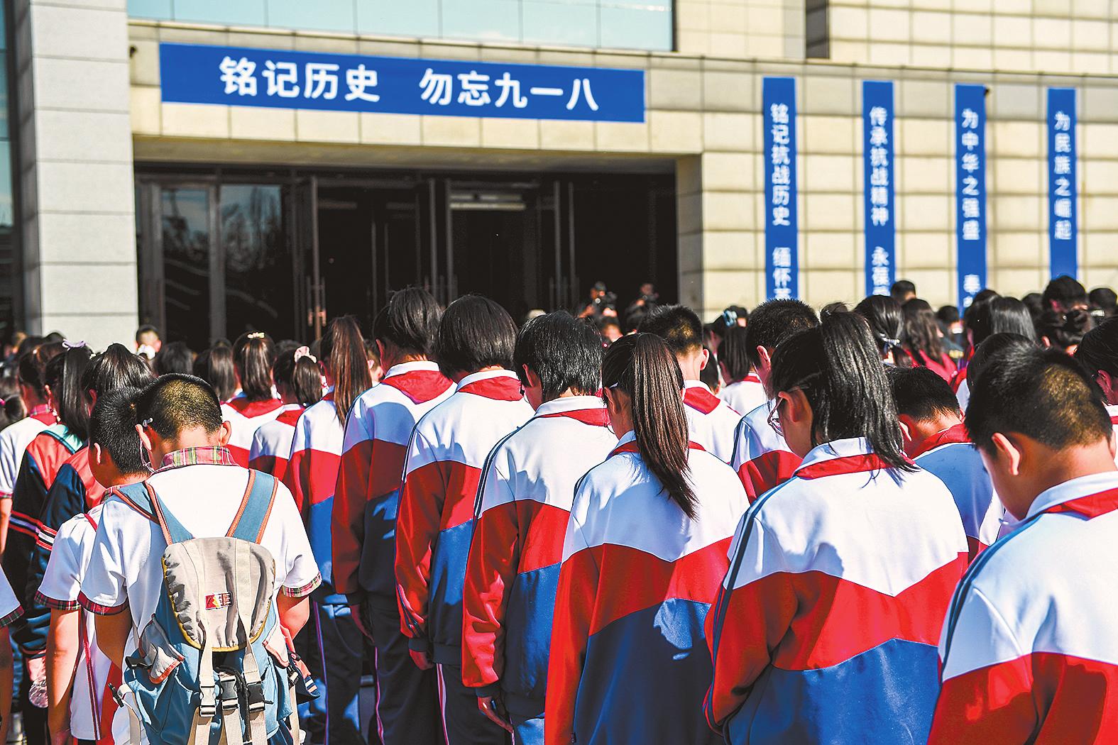 9月18日,在位于吉林长春的伪满皇宫博物院东北沦陷史陈列馆门前,人们低头默哀,缅怀革命先烈和死难同胞。