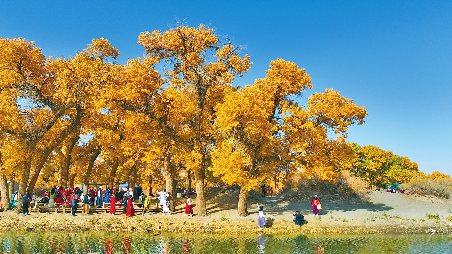 10月13日,游客在内蒙古阿拉善盟额济纳旗额济纳胡杨林旅游区游玩(无人机照片)。近日,内蒙古阿拉善盟额济纳旗的胡杨林进入最佳观赏期,吸引众多游客前来观赏游玩。10月1日至10月12日额济纳旗总旅游人次超过136万,同比增长9.83%。