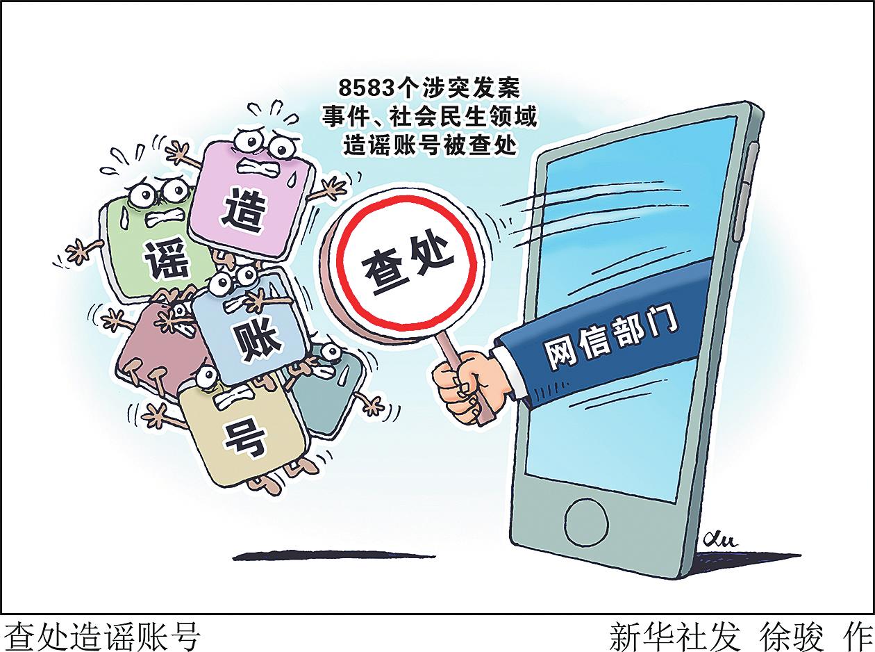 近期,一些网络账号以无中生有、移花接木、翻炒旧闻等方式,编造公共政策、社会民生、突发案事件等领域的谣言,严重误导网民认知,造成公众恐慌,影响社会和谐稳定。网信部门指导网站平台持续加大监测和处置力度,及时溯源并关闭谣言首发账号,累计处置相关违法违规账号8583个。