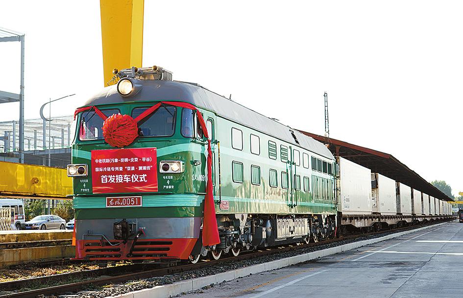 这是10月20日在北京市平谷区京平综合物流枢纽拍摄的中老铁路(万象—昆明—北京·平谷)国际冷链专列。当日,首趟中老铁路(万象—昆明—北京·平谷)国际冷链专列暨“京滇·澜湄线”抵达北京市平谷区京平综合物流枢纽,首发接车仪式同期举行。 据了解,本趟国际货运班列10月12日从老挝万象南站驶出,运载着产自老挝的390吨优质香蕉,由磨憨口岸入境,通过全程冷链运输抵达北京。 新华社记者 任超 摄(新华社10月20日发)