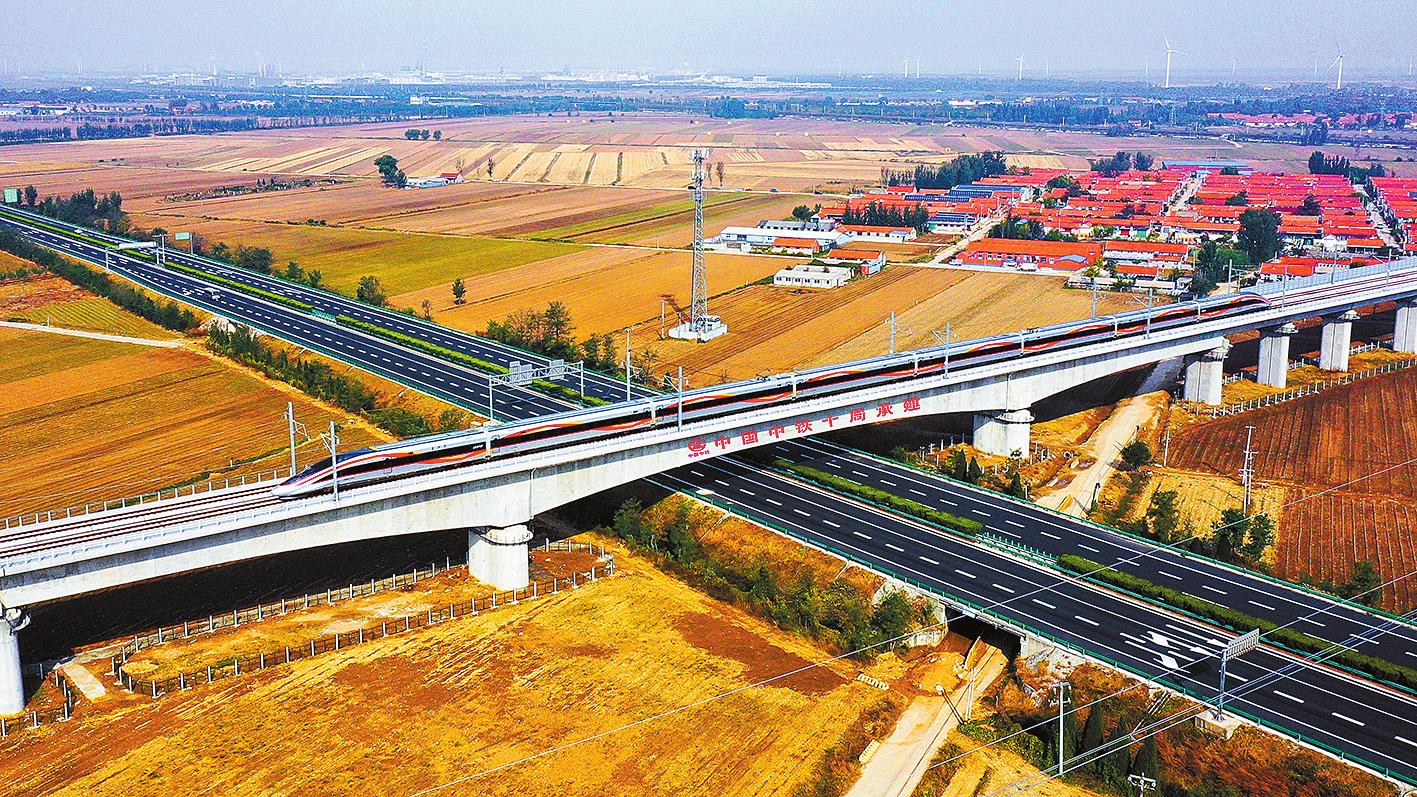 10月21日,一辆复兴号列车驶过潍烟高铁昌平特大桥。