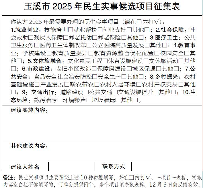 为全面贯彻落实党的二十大精神,深入践行以人民为中心的发展思想,更好倾听民声、集中民智、反映民意,切实解决人民群众急难愁盼问题,厚植可感可及的民生福祉,市人民政府决定,面向全社会公开征集2025年玉溪市民生实事候选项目。现将有关事项通告如下: 一、征集时间 自本通告发布之日起,至2024年12月6日止。 二、征集原则 坚持人民至上,按照“尊重民意、普惠共享,突出重点、注重实效,尽力而为、量力而行”的原则,根据轻重缓急,重点选取群众反映最强烈、覆盖受惠面广、最迫切需要解决的事项,力争当年实施、当年见效。 三、征集内容 围绕就业创业、社会保障、医疗卫生、教育事业、文体旅融合、市政建设、公共安全、乡村振兴、交通出行、生态环境等与人民群众生活密切相关的重大民生事项。 四、征集方式 主要采取互联网、信函、电子邮件等方式征集,要求一项目填写一张表格,有具体的目标和内容,表述简明扼要。为便于联系和进一步征求意见,请说明联系方式。 (一)信函征集。邮寄地址:玉溪市人民政府办公室1213室,信封正面请注明“2025年民生实事候选项目征集”。 (二)邮箱征集。发送邮箱:1161589437@qq.com,邮件主题请注明“2025年民生实事候选项目征集”。 请广大人民群众、社会各界人士积极献言献策,围绕《玉溪市2025年民生实事候选项目征集表》进行填写,提出当前亟需解决、涉及面较广、具有可行性的意见、建议,市人民政府将在广泛征求各方意见、建议的基础上,组织相关职能部门进行分析、评估和论证,依法依规提出民生实事候选项目,经市人民代表大会投票表决后组织实施。 附:玉溪市2025年民生实事候选项目征集表 玉溪市人民政府办公室 2024年11月6日 |