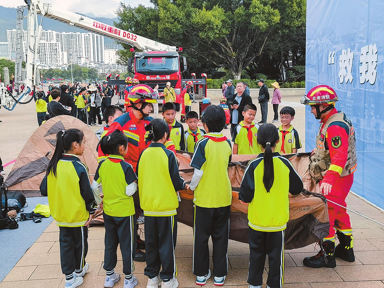 为扎实开展好消防宣传相关活动,深化消防宣传教育,增强全民消防安全意识,11月1日,新平县在民族广场举行“同升国旗 同唱国歌”暨2024年消防宣传月活动启动仪式。启动仪式后,现场群众及参加活动的小学生们参观体验了各类灭火救援、抢险救援、地震救援、山难救援、水域救援消防器材与装备,通过与消防员现场互动,进一步提高消防安全意识和逃生自救能力。