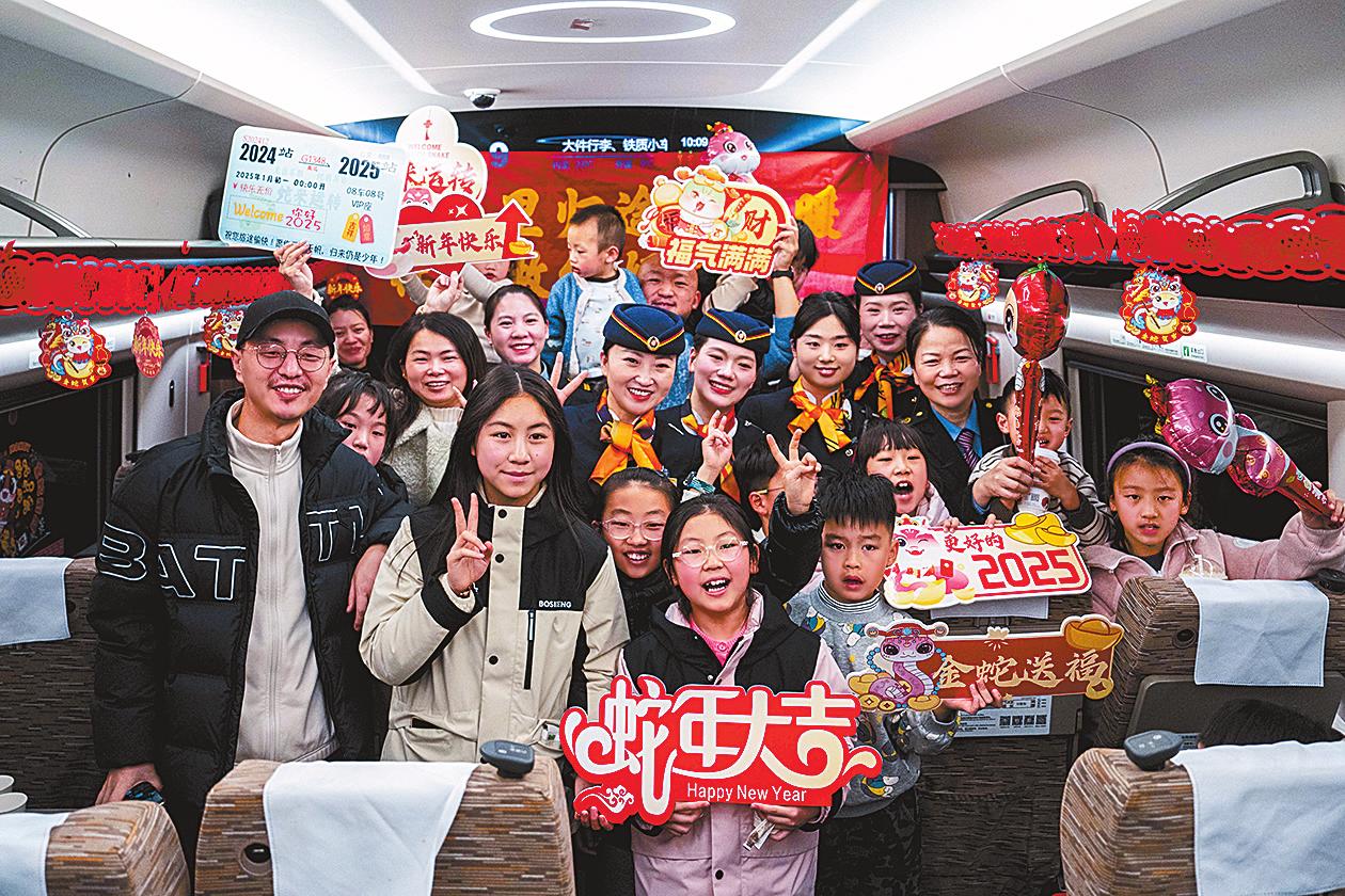 1月27日,G1348次列车工作人员与旅客合影留念。当日,在株洲西开往上海虹桥的G1348次列车上,广铁集团长沙客运段动二车队组织“千里归途服务暖 杜鹃做伴好还乡”主题活动,为旅客们送上节日祝福,让旅客在旅途中感受浓浓的年味。