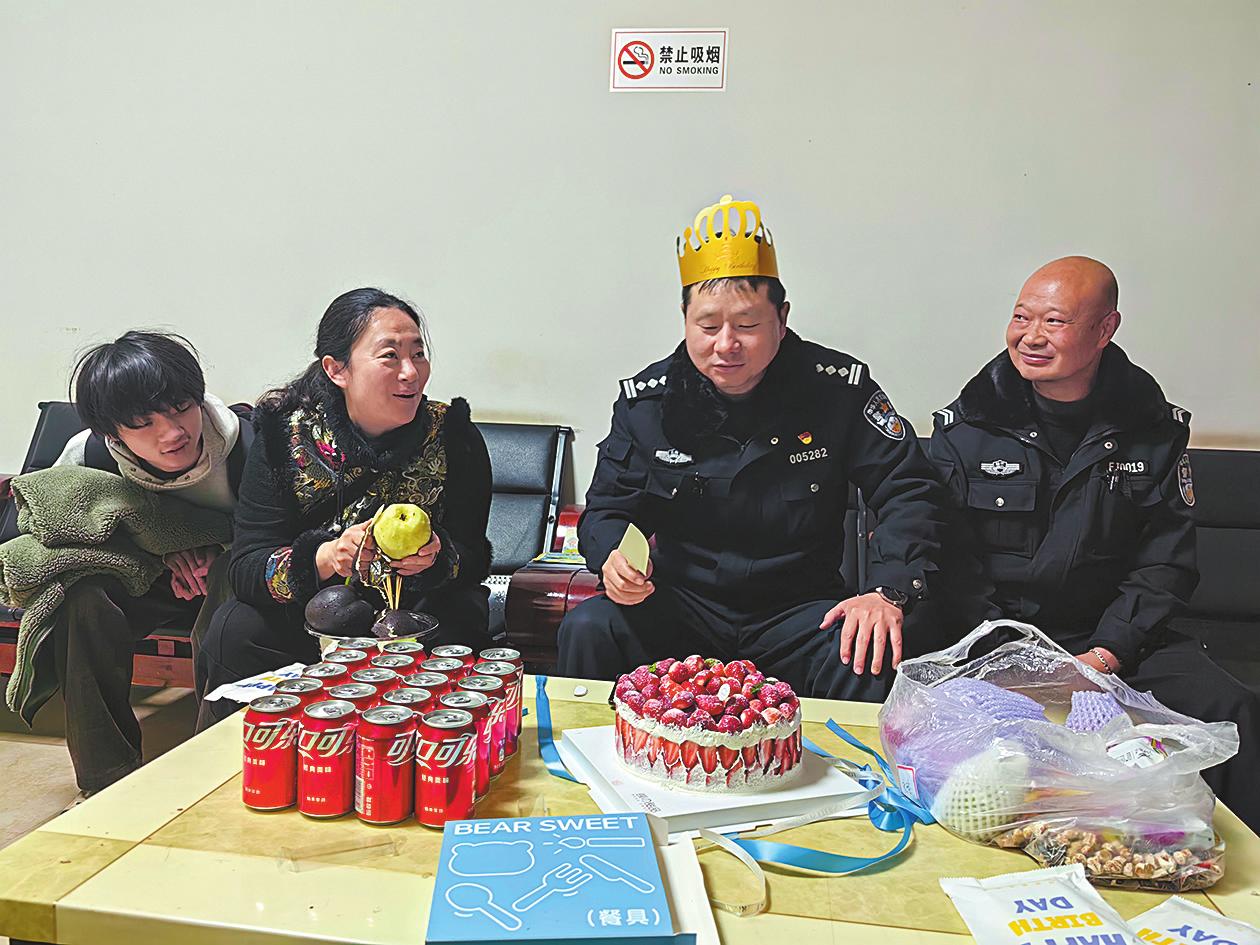 □ 通讯员 李宗明 文/图 节假日是公安民警最忙碌的时候。1月31日,大年初三,玉溪市公安局江川分局交通管理大队民警李江华在春运安保岗位上,过了一个特殊的生日。 1月31日是李江华47岁生日,因为春运安保任务艰巨,他从春节前夕便一直奋战在工作岗位上。同事们得知当天是李江华的生日,提前买好蛋糕、饮料放到值班室准备给他过生日。李江华的家人也提前来到交管大队值班室等他回单位。21时30分,辖区主要道路车流量回落,李江华结束路面巡查工作返回大队值班室,看到同事和家人为自己准备了生日蛋糕,激动得热泪盈眶。吹蜡烛时,同事和家人希望他许个心愿,李江华对着燃烧的蜡烛说:“我最大的心愿就是路畅人安。” 21时55分,一串刺耳的刹车声在值班室外响起,值班室的民辅警第一时间探出窗外查看情况。这是一起车辆与防撞桶相撞的单方事故,车辆损坏严重,防撞桶被撞到非机动车道内。李江华放下手中蛋糕,和大家合力将200斤的沙石防撞桶搬回原位,恢复道路交通秩序。之后帮助司机联系拖车,处置事故。事故处置完后,大家返回值班室继续为李江华过生日。蛋糕吃到一半,李江华接到到雄关乡配合处置交通事故的指令后,放下手中的蛋糕,开上警车继续出发。 当生日遇上春节,民警用自己的坚守,守护着群众平安出行。 |