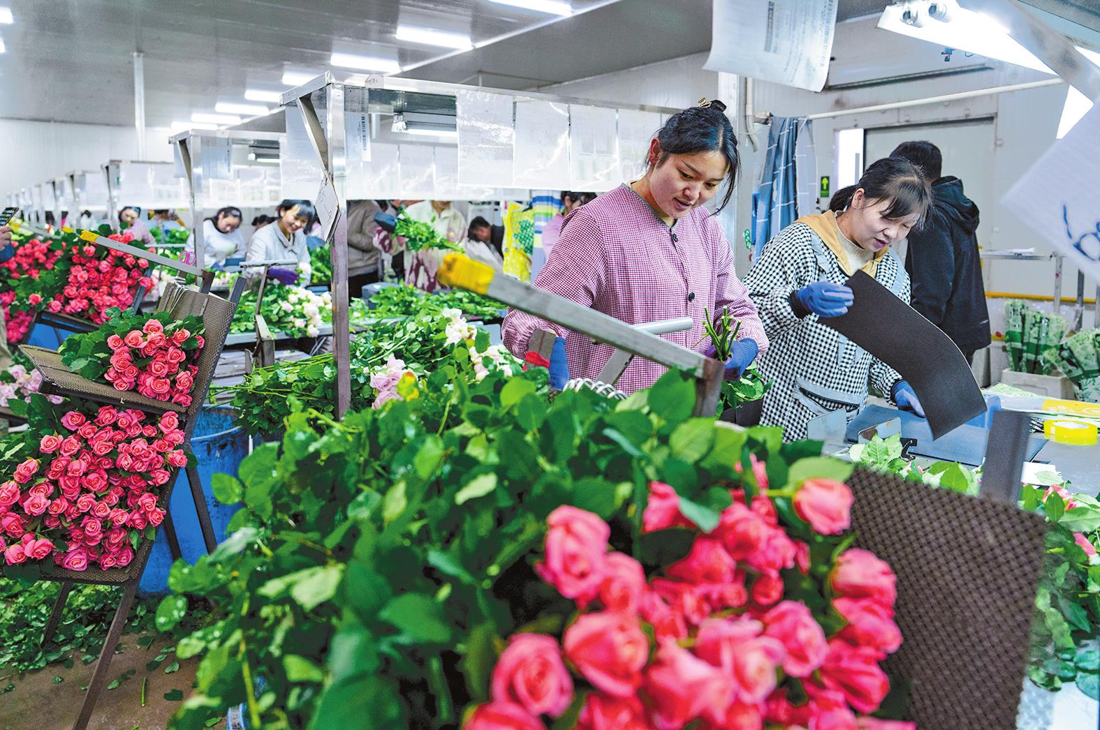 3月16日,花农在姚安毅云花卉有限公司分拣包装车间内包装鲜花。