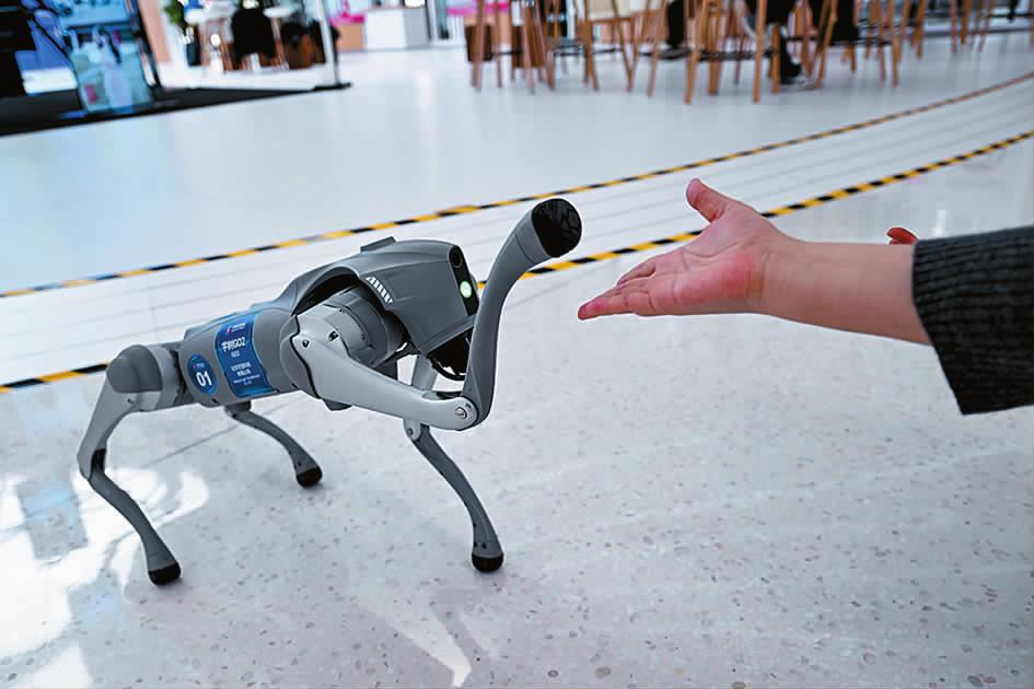 3月26日,一款宇树Go2机器狗在中关村国际创新中心与人互动。新华社记者 陈钟昊 摄